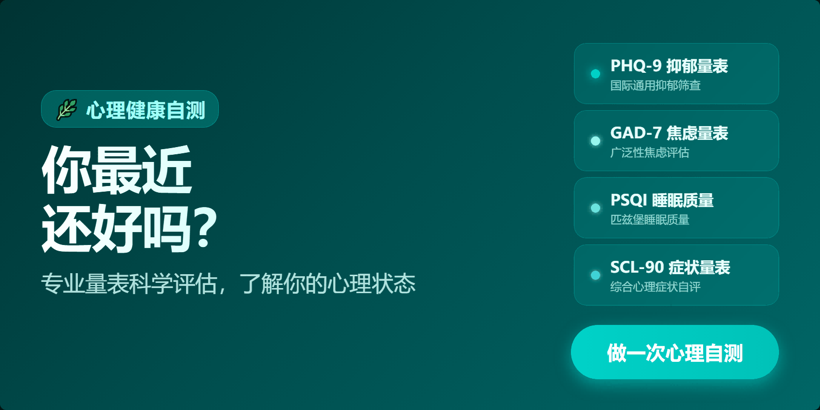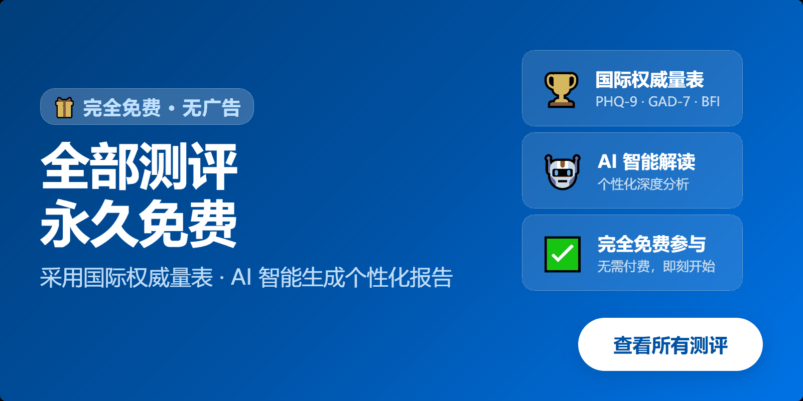科学量表 + AI 解读,全部测评免费参与;结果仅供自我了解,不构成医疗诊断。
