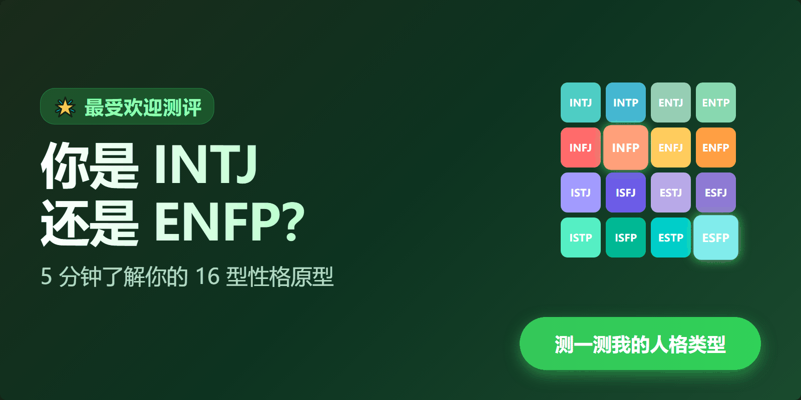 经典 MBTI 风格 93 题,测 E/I、S/N、T/F、J/P 四组偏好,得 16 型人格代码。约15分钟,结果含类型解读。